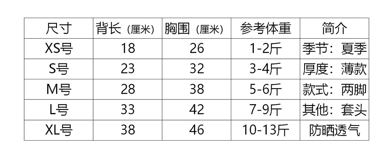 サイズ:XSバック丈18cm推奨1-2kg,S背丈23cm推奨3-4kg,M背丈28cm推奨5-6kg,L背丈33cm推奨7-9kg,XL背丈38cm推奨10-14kg